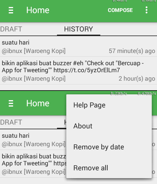 Dibagian Riwayat ini, Semua Tweet yang sudah terkirim akan ditampilkan, anda bisa menghapus semua atau berdasarkan waktu. Tampilan menggunakan halaman, jika sudah mencapai jumlah maksimal perhalaman, maka akan muncul tombol Next/Prev.